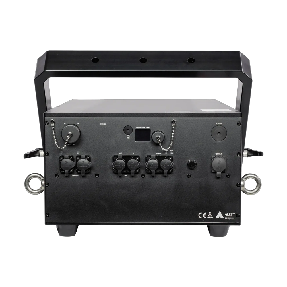 また、Elite PRO FB4 (IP65) レーザーには、最新のレーザー安全機能 (非常停止と手動リセットによるインターロック、発光遅延、機械式シャッター、マスキング プレートなど) が装備されています。便利な外部調整も FB4 デジタルディスプレイを介して行うことができ、サイズ、位置、回転、色、幾何学補正などの調整が可能です。さらに、イーサネット入出力、電源入出力 (10、20、30 W モデルは入出力、60、100Wモデルは入力のみ)、DMX 入出力、および Estop 入出力接続を備えています。